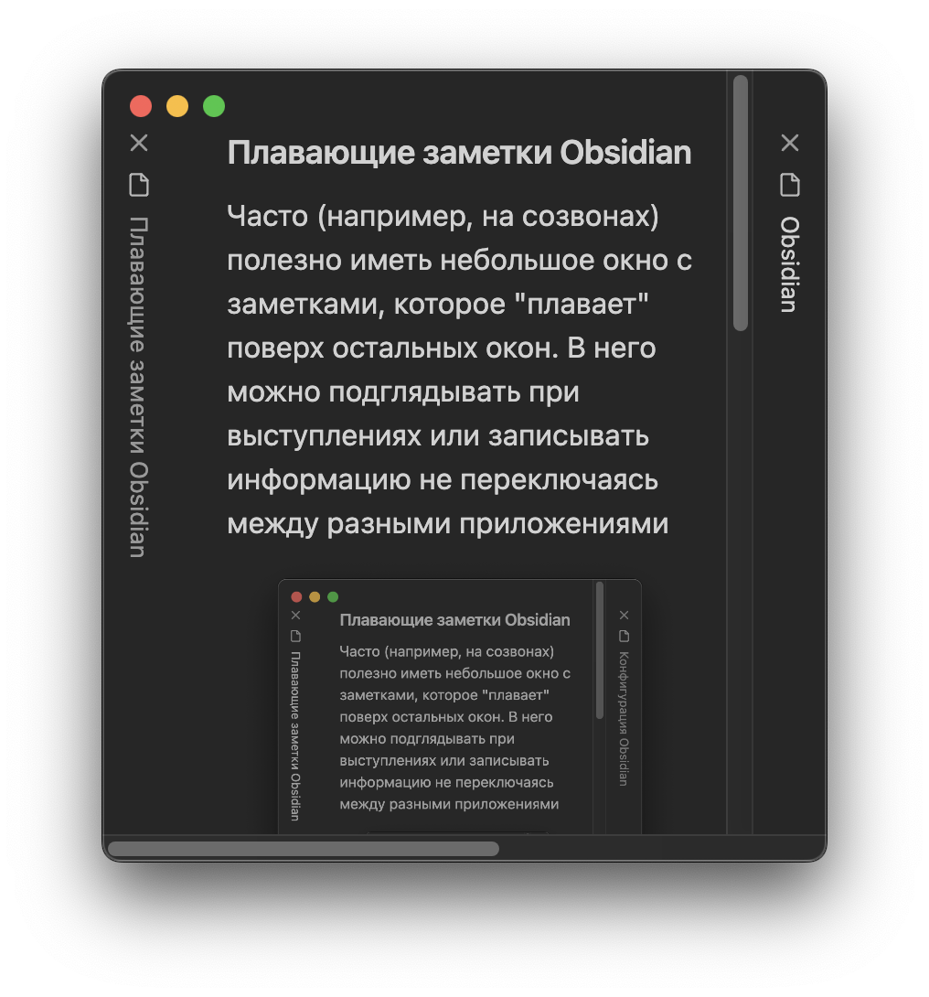 Часто (например, на созвонах) полезно иметь небольшое окно с заметками, которое "плавает" поверх остальных окон. В него можно подглядывать при выступлениях или записывать информацию не переключаясь между разными приложениями